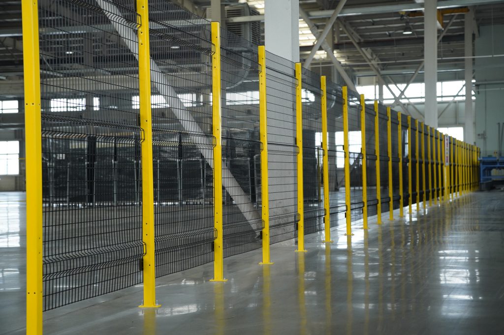 Ограждения из сетки-рабицы или сварной сетки: Предоставляют хороший обзор и вентиляцию. Применяются для ограждения периметров цехов, участков с крупногабаритным оборудованием.